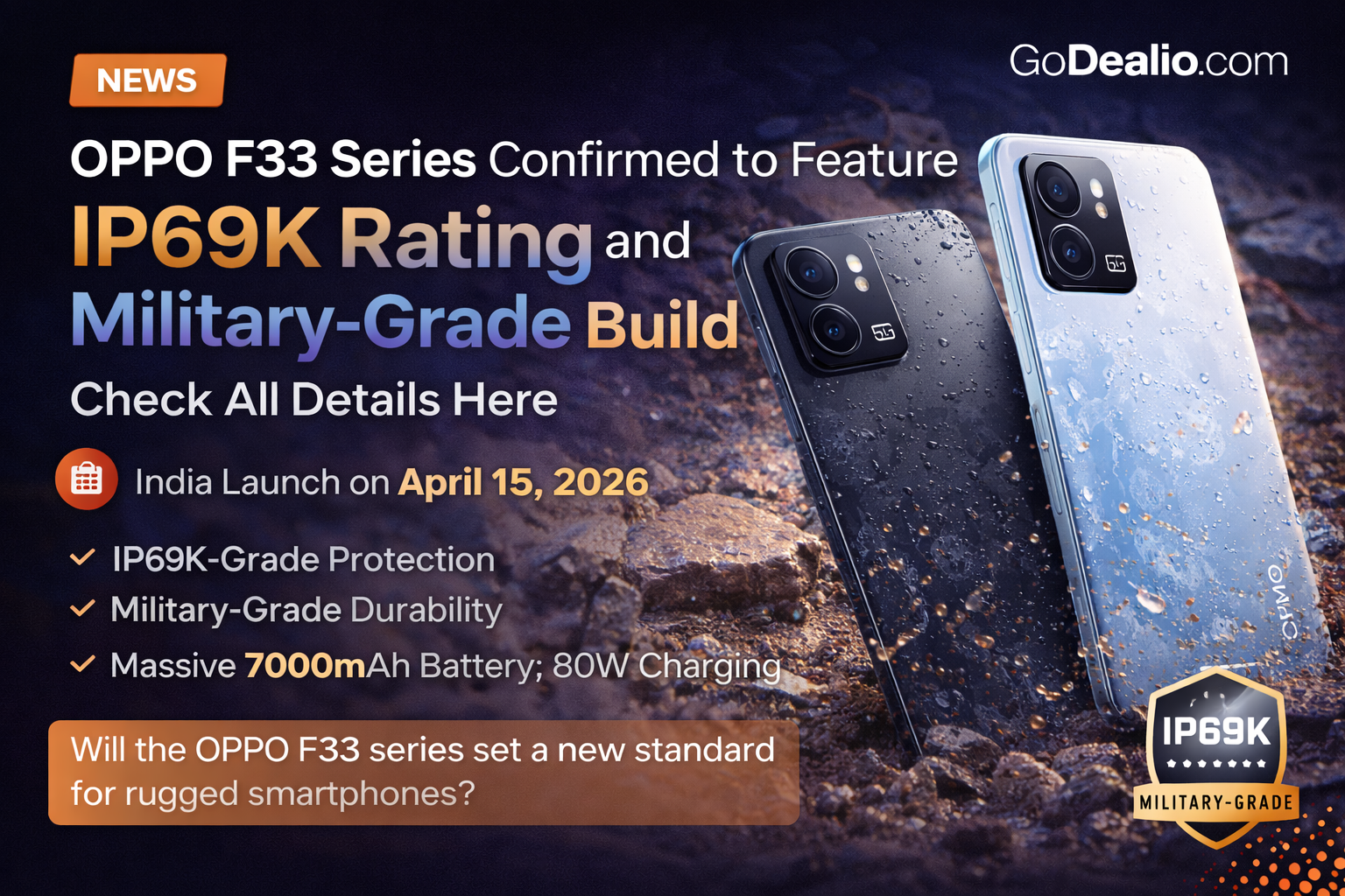 OPPO has officially confirmed that the upcoming F33 series will emphasize durability and battery life. The lineup is set to launch in India on April 15, 2026, and the company has already highlighted IP69K-rated protection, military-grade durability messaging, and a 7000mAh battery as key selling points. This positions the F33 series as a more rugged mainstream option in the mid-range segment.